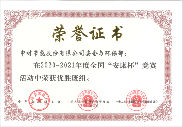 近日,中華全國總工會、中華人民共和國應(yīng)急管理部、國家衛(wèi)生健康委員會聯(lián)合發(fā)文,表彰2020—2021年度“安康杯”競賽先進集體和優(yōu)秀個人,中材節(jié)能股份有限公司(以下簡稱“中材節(jié)能”或“公司”)安全環(huán)保部榮獲2020-2021年度全國“安康杯”競賽優(yōu)勝班組榮譽稱號。