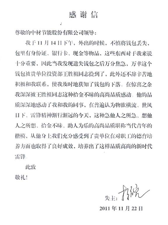 事后,王勝祖說:“當我撿到錢包時,馬上想到失主現在肯定是心急如焚,我也曾經丟過錢包,對于那種焦急的心情特別理解,我所能做的就是想辦法盡快與失主取得聯系,讓失主盡早放下焦慮與擔心”。李先生被王勝祖這種想他人所想、樂于助人的高尚品質所感動,專門發來一封感謝信以表他的感激之情。