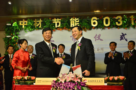 掛牌儀式上,中材節能董事長張奇與上交所副總經理劉世安簽訂了《上市協議書》。中材集團董事長劉志江與天津市政府副秘書長袁樹謙共同敲響了上市銅鑼。