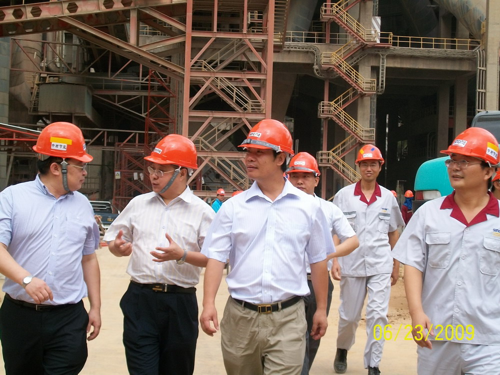 6月,何新平總經理、魏文華副總經理、董蘭起副總工程師等一行七人,也趕到京都項目現場檢查、指導工作。到現場后顧不上休息,換上安全鞋,戴上安全帽,風塵仆仆視察了循環水冷卻塔、化學水處理室、汽輪發電機廠房、SP5鍋爐、AQC5鍋爐、AQC6鍋爐、SP6鍋爐等施工工地。何總對每個項目都仔細觀察,了解各個環節的關鍵點及存在問題,在SP5鍋爐看到所在位置錯綜復雜,水泥線的輸送從框架中間穿過,并且被水泥線的窯尾、生料磨房、生料輸送三面包圍,又由于和汽輪發電機廠房相距較近,根本沒有鍋爐鋼架制作場地。就明確指出SP5是京都項目工程中的關鍵點,加快土建施工速度是首要問題,決不能因為土建而貽誤工期。何總在現場與魏總、董總、王品副部長及京都項目吳蘇軍經理商量后,當場拍板:為了加快施工進度,將鋼筋混凝土框架改為鋼筋混凝土框架柱,平臺改為鋼結構形式。對其它各點也進行了精辟地一一闡述……