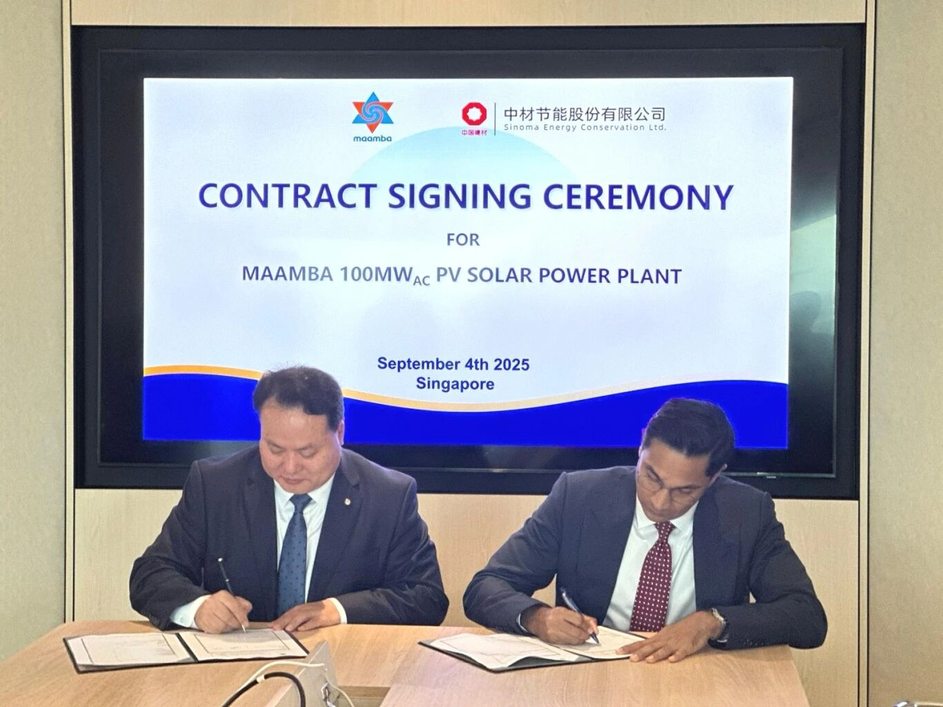 On September 4th, Liu Xin, President of Sinoma Energy Conservation Limited, and Ashwin Devineni, CEO of Nava Limited, signed the EPC contract for the MAAMBA 100MWac PV Solar Power Project in Singapore.